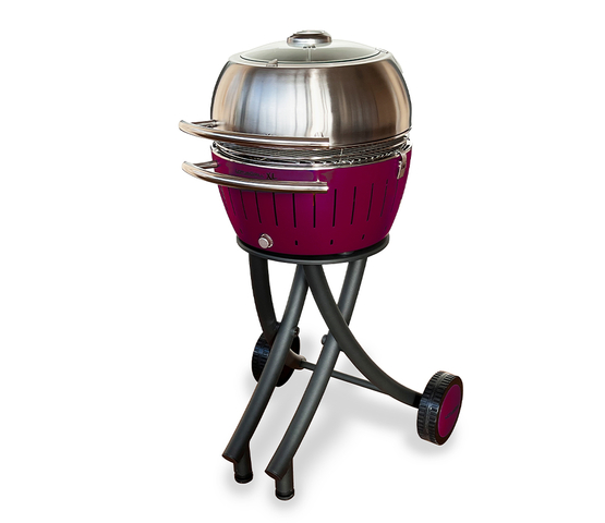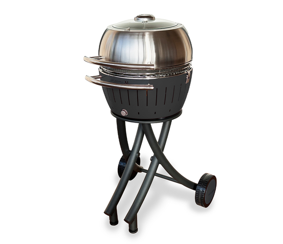 The set consists of a LotusGrill XL mounted on a barbecue cart with a stainless steel barbecue hood XL. Two generous stainless steel handles make it easier to maneuver the set in your garden or terrace and to handle the elegant grill hood with viewing glass insert and integrated thermometer. The solid aluminum hinge ensures the snug fit of the hood.